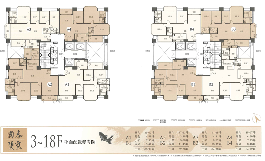『國泰雙璽』A棟臨光明街,B棟臨未開闢的計畫道路,仔細看65坪的A3/B3戶內有2套衛浴是暗房、61坪的A1/B1戶3間雅房共用1衛浴比較不佳,55坪的A4/B4戶和73坪的A2/B2戶都規劃的不錯。