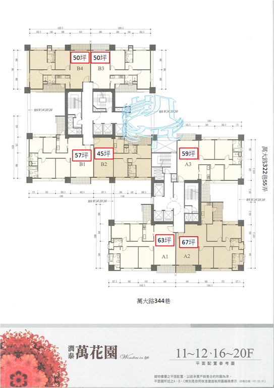 | 坪數 | A棟:單層3戶(59、63、67坪) B棟:單層4戶(45、50、57坪) |