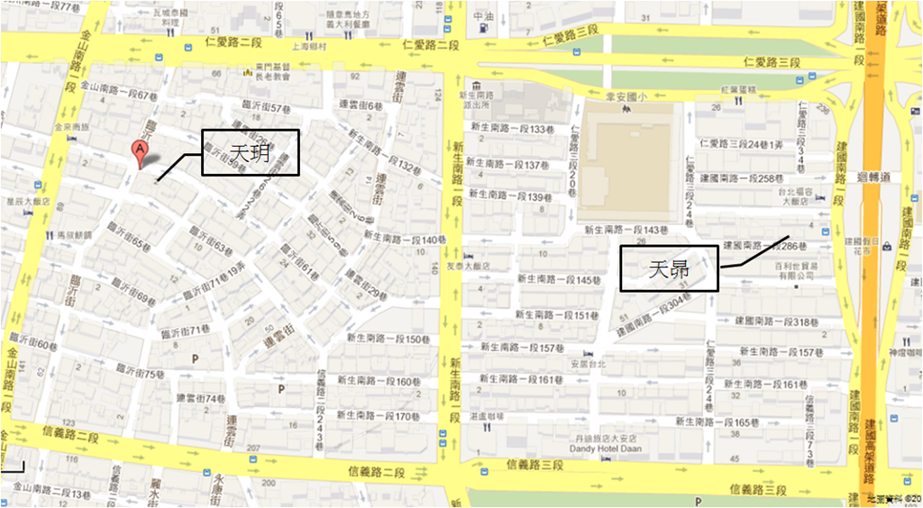 | 地點 | 中正區臨沂街61巷2號(天玥) 大安區建國南路一段286巷5號(天昴) |