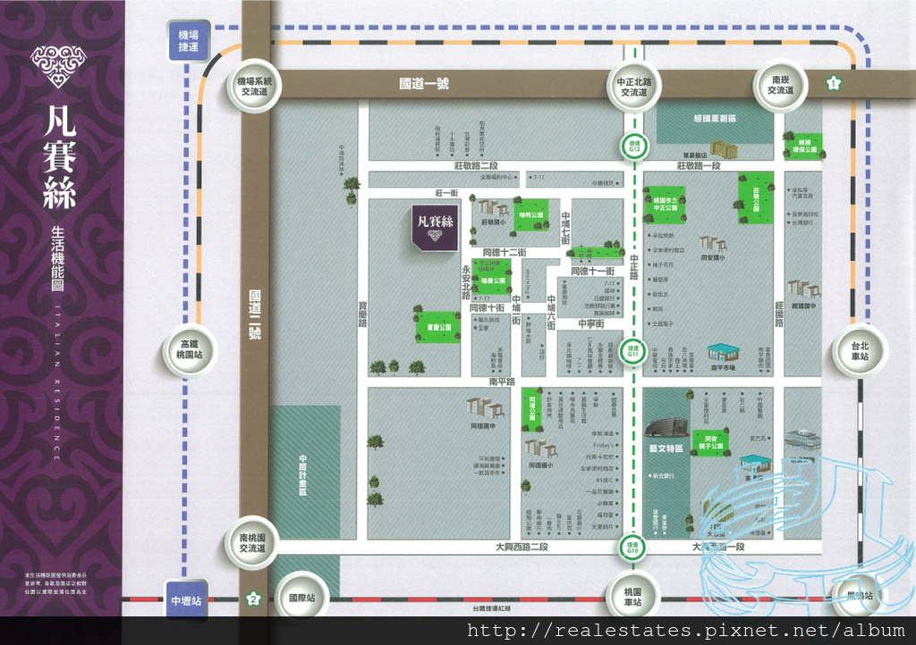 『凡賽絲』位在莊敬國小旁,週邊很多大型住宅社區,沿路走入莊一街整體居住寧適性高,且散步至展演中心約10分鐘,沿中正路上食衣住行娛樂的商家均有,路途中也不覺得無趣,很多週邊的社區住戶都捨棄自家的健身房,反而選擇到藝文特區運動,享受大片草皮的自然感。交通方面,車行至南崁及中正北路交流道都不遠,距離G11捷運站也算近,目前捷運綠線在2014年7月已通過環評,原本預計2015年中開工,2021年完工通車,目前看起來還沒有開工的準備,預計時程應該會延宕,且未來中正路沿線都要忍受施工時期的噪音及不便性。