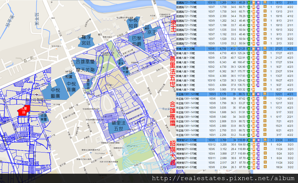 凱飛查詢了一下103年的實價登錄資訊,中正藝文特區周邊10年內社區整體成交均價約在30~33萬元/坪,目前實價登錄尚未出現『凡賽絲』的價格,『合雄凰璽』成交均價約在33萬/坪,『合遠京王』成交均價約在31~33元萬/坪,『葛里法五世』正對藝文廣場單價最高,成交均價約在38萬元/坪,『昭揚大器』成交均價約在28~30元萬/坪。由此可見藝文特區的價格支撐力道在30萬元/坪,以藝文廣場為中心點,依序向外遞減,且新成屋與10年內中古屋的價差不大。